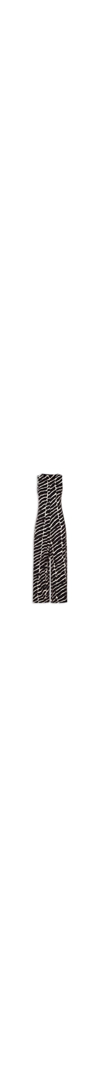 O macacão preto é confeccionado em tecido leve com alta elasticidade. A peça solta ao corpo possui decote redondo, cavas regulares, alças médias, comprimento longo e padronagem abstrata em cor contrastante branco.