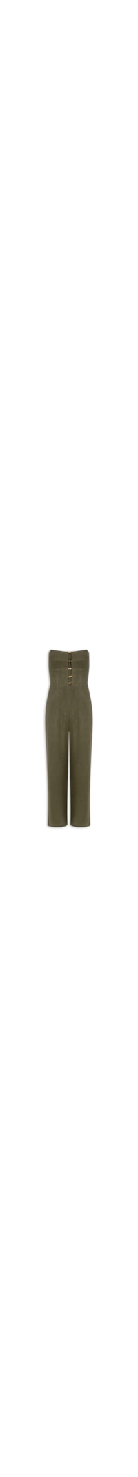 O macacão verde é confeccionado por linho com toque de algodão sem elasticidade. A peça de modelo tomara que caia é solta ao corpo, possui decote redondo, recortes frontais vazados com detalhes metálicos, recorte em elástico posterior, fechamento por zíper e comprimento longo.
