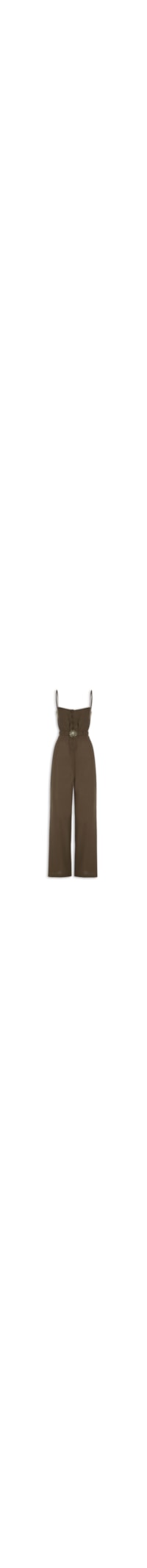 O macacão marrom é confeccionado em tecido leve com toque de linho sem elasticidade. A peça solta ao corpo, possui decote quadrado, alças finas reguláveis, bolsos laterais embutidos, comprimento longo e fechamento frontal por botões forrados. Acompanha cinto em tecido com elástico embutido, detalhe metálico em formato figurativo de sol e fechamento posterior por encaixe metálico.