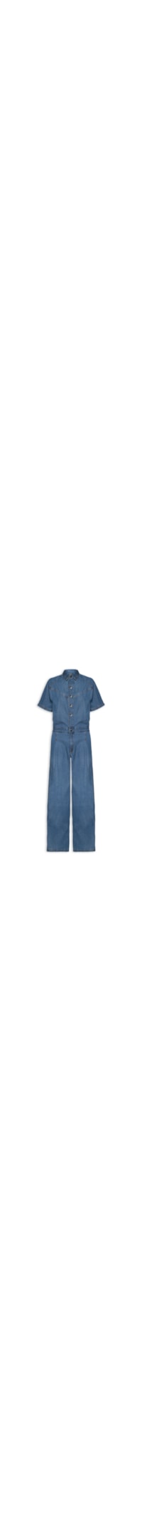 O macacão azul é confeccionado em sarja com lavagem jeans. A peça solta ao corpo possui colarinho simples, mangas curtas de modelo raglan, recortes e pences frontais, tag metalizada da marca aplicada na parte posterior, bolsos posteriores e frontais embutidos, cós posterior com tiras sobrepostas com botões de pressão para ajuste, detalhes pespontados em tom contrastante, comprimento longo e fechamento frontal em botões de pressão e zíper.