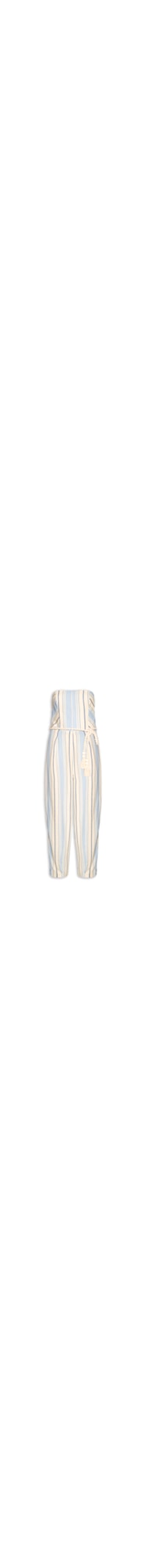 O macacão azul é confeccionada em tecido leve com toque de linho e sem elasticidade. A peça modelo tomara que caia solta ao corpo possui decote reto, bolsos frontais embutidos, lastex aplicados nas laterais, padronagem de listras em cores contrastantes, pregas frontais, comprimento cropped* e fechamento posterior por zíper.