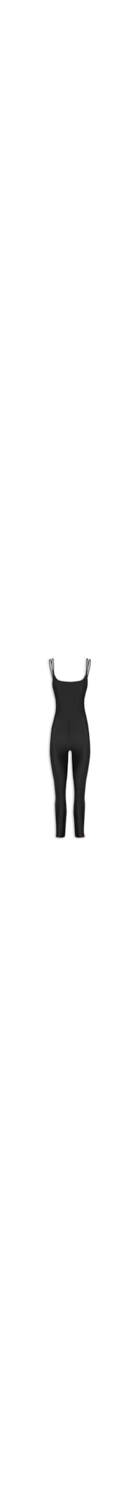 O macacão preto é confeccionado em malha leve com alta elasticidade. A peça justa ao corpo possui decote arredondado, alças finas duplas, ombros com tiras paralelas, caimento ajustado ao busto e pernas, recortes anatômicos que acompanham a silhueta, barra ajustada no comprimento e não possui fechamento.