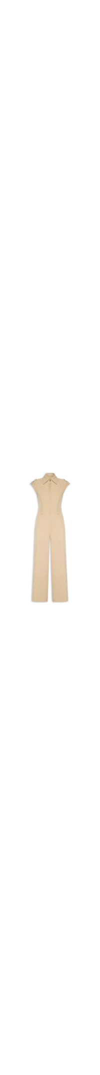 O macacão bege é confeccionado em tecido leve e baixa elasticidade. Apeça solta ao corpo possui colarinho clássico, alças largas com detalhe de martingale nos ombros, cavas regulares, bolsos frontais modelo faca, passantes aplicados na cintura, comprimento longo e fechamento frontal por botões com vista sobreposta e zíper. Acompanha cinto em material sintético na cor preta para uso opcional.