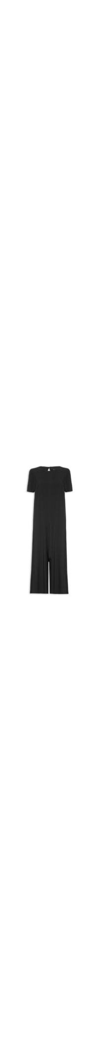 O macacão preto é confeccionado em malha com alta elasticidade. A peça solta ao corpo possui decote redondo, mangas curtas, recorte posterior vazado com botão aplicado, recorte frontal e comprimento cropped*.