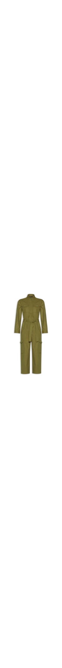 O macacão verde é confeccionado em tecido leve sem elasticidade. A peça solta ao corpo possui gola alta, mangas longas com martingales na altura dos punhos, bolsos posteriores decorativos, passantes aplicados na altura da cintura, bolsos frontal e laterais modelo cargo, bolsos frontais embutidos na altura do quadril com aba e botão aplicado, comprimento cropped* e fechamento frontal por botões e zíper com vista sobreposta. Acompanha cinto no mesmo tecido e cor para uso opcional.