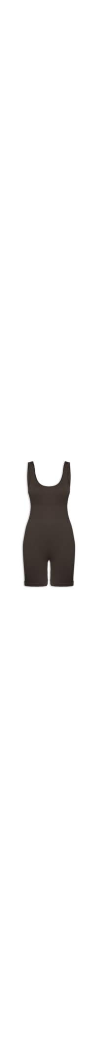 O macacão marrom é confeccionado em malha de poliamida com baixa elasticidade. A peça justa ao corpo possui decote frontal e posterior arredondado, alças médias, recortes frontais e posteriores, inicial da marca aplicada na parte posterior e comprimento curto.