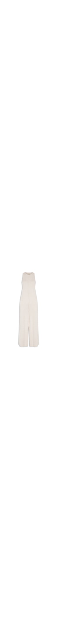 O macacão bege é confeccionado em malha com toque de linho e média elasticidade. A peça solta ao corpo possui decote frontal redondo, cavas estendidas, recorte posterior vazado, comprimento longo e fechamento posterior por zíper com puxador em gorgurão com o nome da marca em baixo-relevo.