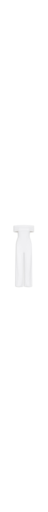 O macacão branco é confeccionado em malha de média elasticidade. A peça justa ao corpo possui decote ombro a ombro em recorte sobreposto na parte superior, mangas curtas deslocadas e comprimento longo.