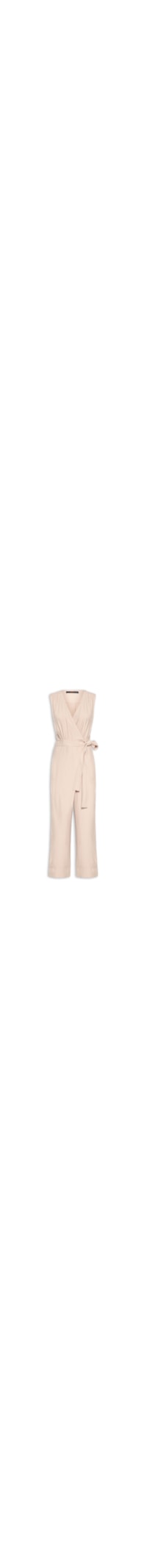 O macacão bege é confeccionado em tecido leve sem elasticidade. A peça solta ao corpo possui decote V transpassado, cós com passante e tiras alongadas embutidas para amarração sobreposta na lateral, detalhes franzidos, bolsos frontais embutidos, recorte posterior com prega, pences posteriores, barra italiana estendida e fechamento frontal interno em zíper invisível.