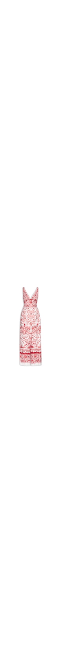 O macacão vermelho é confeccionado por tecido leve sem elasticidade. A peça solta ao corpo possui decote V, alças finas com ajuste, cavas estendidas, detalhes franzidos no busto, bolsos frontais no modelo faca, pregas frontais, recorte posterior em lastex, mix de estampas em cor contrastante e comprimento longo.