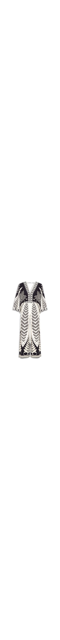 O macacão preto é confeccionado em malha com média elasticidade. A peça solta ao corpo possui decote V, mangas longas 7/8 de modelo morcego, elástico embutido na cintura, mix de estampas na cor off white e comprimento longo.