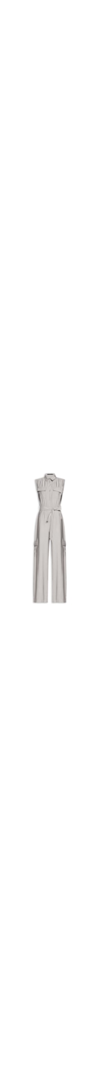 O macacão cinza é confeccionado em tecido leve sem elasticidade. A peça solta ao corpo possui colarinho clássico, ombros estendidos com detalhe franzido, bolsos frontais com fechamento em aba sobreposta na altura do busto, recorte posterior, passantes aplicados na altura da cintura, bolsos frontais embutidos, bolsos laterais de modelo cargo, comprimento longo e fechamento frontal em botões. Acompanha cinto em tira média alongada da mesma cor e tecido para amarração e uso opcional.