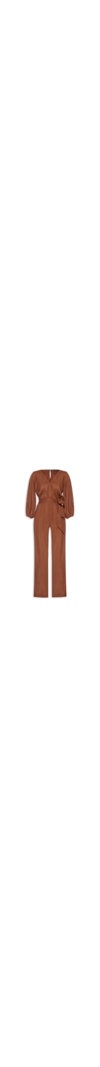 O macacão marrom é confeccionado em tecido leve com toque de linho sem elasticidade. A peça solta ao corpo possui decote V transpassado com fechamento por botão de pressão, mangas 7/8 bufantes, recorte posterior vazado com botão aplicado, elástico embutido na altura da cintura e comprimento longo. Acompanha cinto no mesmo tecido e cor com espessura média.