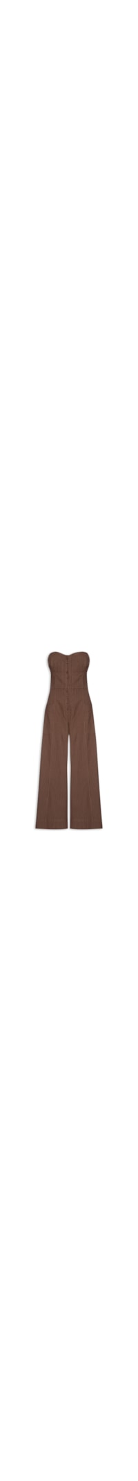 O macacão marrom é confeccionado em tecido leve sem elasticidade. A peça de mdoelo tomara que caia justa na altura do busto e da cintura e solta no comprimento possui decote coração, recorte posterior com elástico embutido, sem bojo, recortes frontais, padronagem risca de giz na cor bege, bolsos frontais, comprimento longo, recorte frontal com botões bordados e fechamento lateral por zíper invisível.