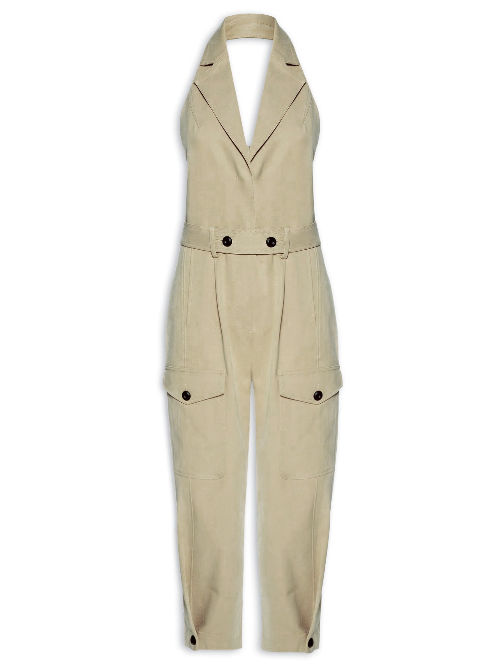O macacão bege é confeccionado em sarja sem elasticidade. A peça de modelo frente única solta ao corpo possui decote V com lapela aplicada, alças médias, bolsos posteriores e frontais com fechamento por botão, passantes aplicados na altura da cintura, bolsos frontais modelo faca, comprimento cropped*, forro, barra com botões aplicados na parte frontal e fechamento frontal por botões de pressão e zíper. Acompanha cinto no mesmo tecido e cor para uso opcional.