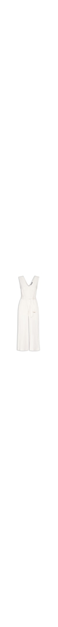 O macacão off whte e confeccionado em tecido leve com toque de linho sem elasticidade. A peça solta ao corpo, possui decote em V, alças largas, cavas estendidas, passantes aplicados na cintura, bolsos laterais embutidos, decote V posterior, comprimento cropped* e fechamento posterior por zíper. Acompanha cinto de tecido para amarração.