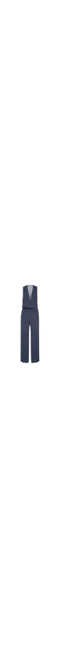 O macacão azul é confeccionado em tecido leve sem elasticidade. A peça solta ao corpo, possui decote em V transpassado com tira fina aplicada e detalhes metálicos, alças largas com pregas nos ombros, cavas estendidas, elástico embutido na cintura, leve transparência superior, comprimento longo e fechamento posterior por botão. Acompanha lenço assimétrico em mesmo tecido com detalhes metálicos e ponteiras de miçangas metálicas para amarração opcional.