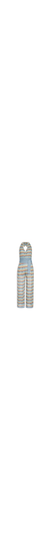 O macacão azul é confeccionado em tricot com fios de lurex e alta elasticidade. A peça solta ao corpo, de modelo frente única, possui decote em V transpassado, alças largas com amarração posterior, cavas regulares, elástico abaixo do busto, padronagem chevron em cores contrastantes e forro. Acompanha faixa de mesma estampa e tecido para uso opcional.