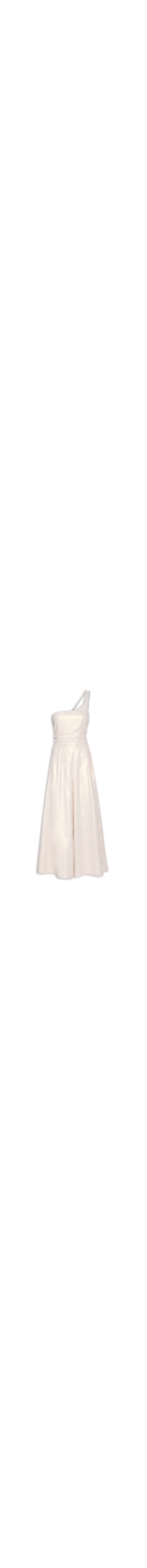 O macacão bege é confeccionado em lino misto com superfície brilhosa sem elasticidade. A peça solta ao corpo, possui decote ombo único, alças finas duplas, reguláveis, faixa de silicone na parte interna do decote, recorte frontal, franzido lateral na cintura, pregas frontais, franzido posterior, comprimento longo, forro e fechamento posterior por zíper invisível.