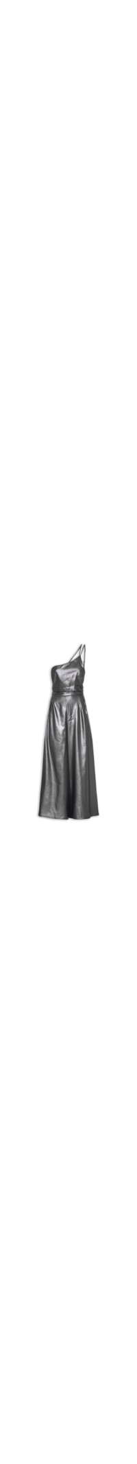 O macacão prata é confeccionado em lino misto com superfície brilhosa sem elasticidade. A peça solta ao corpo, possui decote ombo único, alças finas duplas, reguláveis, faixa de silicone na parte interna do decote, recorte frontal, franzido lateral na cintura, pregas frontais, franzido posterior, comprimento longo, forro e fechamento posterior por zíper invisível.