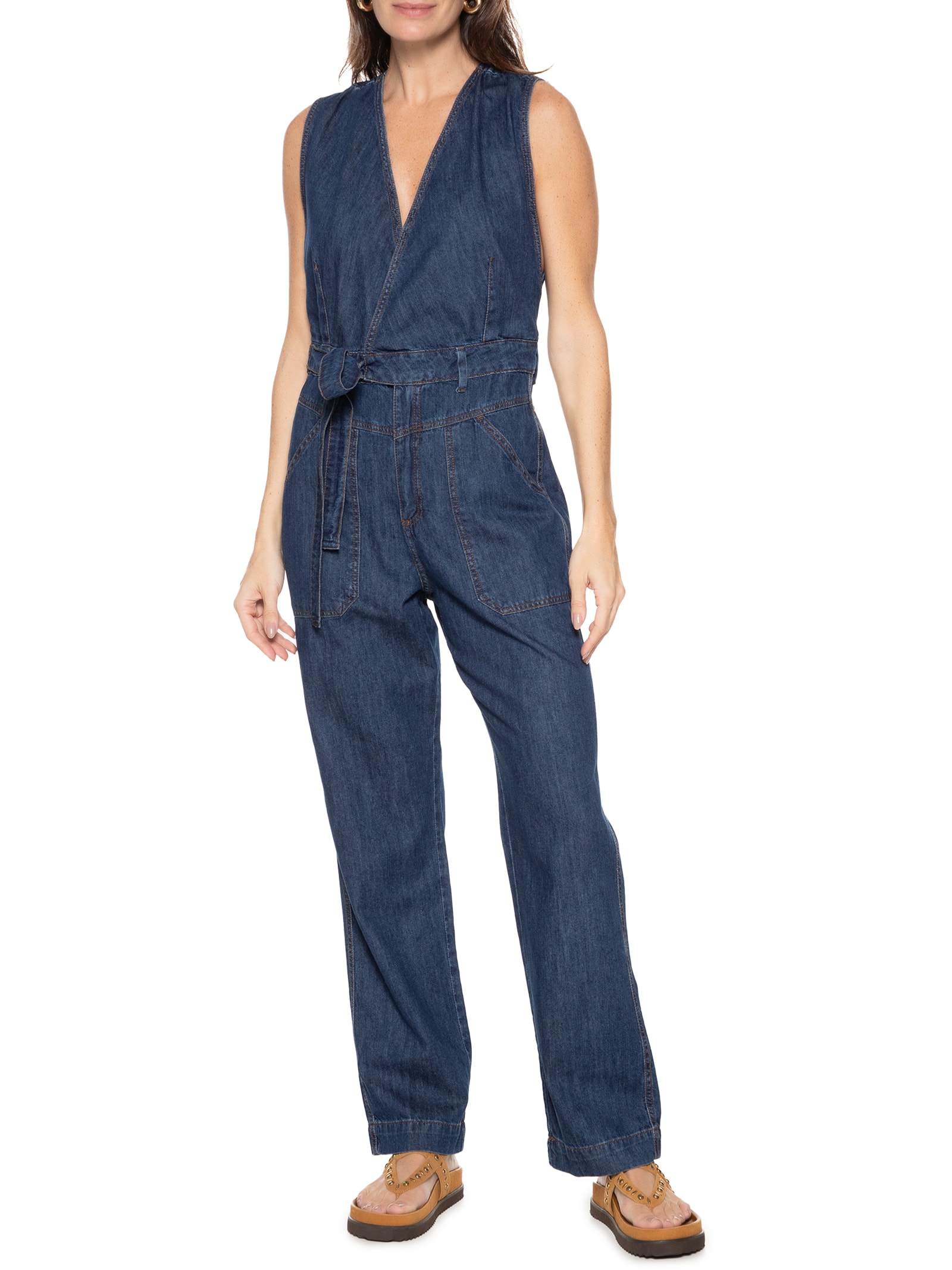 O macacão azul é confeccionada em sarja com lavagem jeans sem elasticidade. A peça solta ao corpo possui decote em V profundo, alças largas, cavas alongadas, passantes aplicados na cintura, bolsos frontais, tiras alongadas de espessura média aplicadas na parte frontal, recortes frontais e posteriores, bolsos posteriores, tag da marca aplicada na parte posterior, comprimento longo e fechamento frontal por botão de pressão, zíper e amarração frontal.