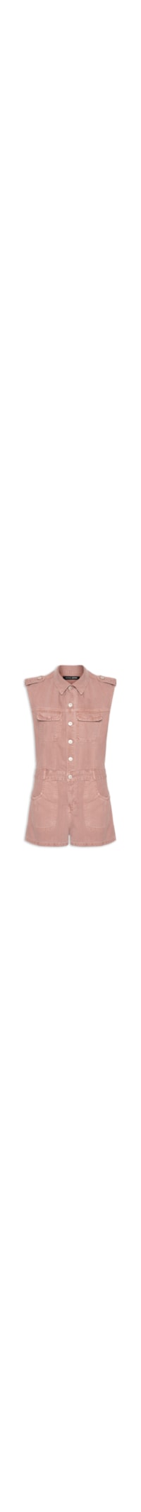 O macacão rosa é confeccionado em sarja sem elasticidade. A peça solta ao corpo possui colarinho simples, alças largas, cavas regulares, cós com passantes na altura da cintura, bolsos frontais e posteriores, recortes frontais e posteriores, comprimento curto e fechamento frontal por zíper e botões de metal.