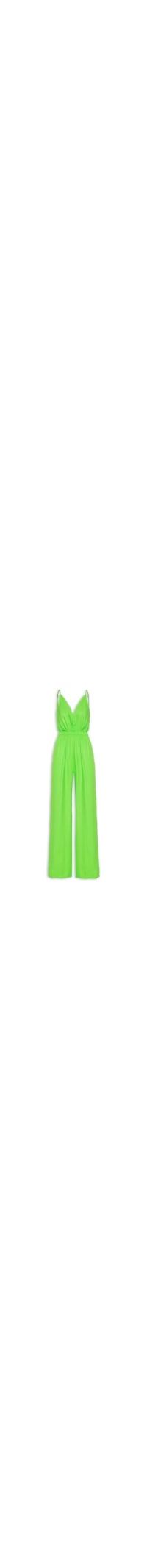 O macacão verde é confeccionado em tecido leve sem elastididade. A peça justa ao corpo possui decote em V, sem bojo, alças finas e reguláveis, elastico embutido na cintura leve franzido na altura da cintura na parte frontal e posterior, elástico na parte posterior do decote, tag metálica da marca aplicada a parte posterior, comprimento longo, sem forro, sem fechamento.
