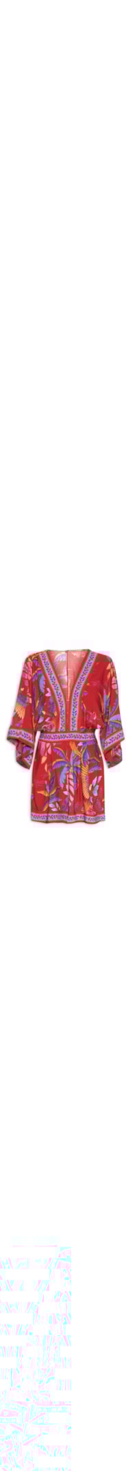 O macaquinho vermelho é confeccionado em tecido leve sem elasticidade. A peça solta ao corpo possui decote V profundo, mangas 7/8 amplas, lastex aplicado na parte posterior, recorte na altura da cintura, mix de estampas com cores contrastantes e fechamento em recorte posterior vazado com botão aplicado.