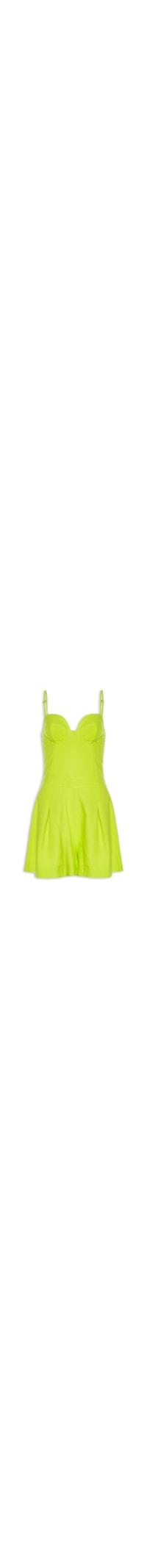 O macaquinho verde é confeccionado em tecido leve com toque de linho e sem elasticidade. A peça justa ao corpo possui decote coração, alças finas e reguláveis, sem bojo, recortes frontais, pregas na parte inferior frontal, short modelo godê, lastex aplicado na parte posterior, comprimento curto e fechamento posterior por zíper invisível.