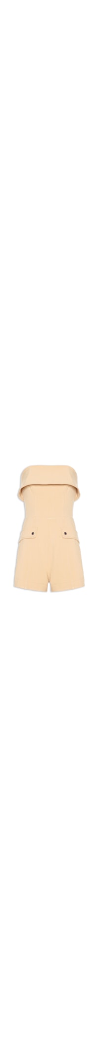 O macaquinho bege é confeccionado em tecido encorpado com baixa elasticidade. A peça justa no busto e solta no corpo de modelo tomara que caia possui decote reto com pala sobreposta, recortes frontais e posteriores, aplicação de abas decorativas com botões decorativos na altura do quadril, comprimento curto, forro e fechamento posterior por zíper metalizado.