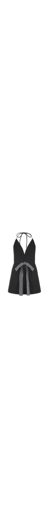 O macaquinho preto é confeccionado em tecido encorpado sem elasticidade. A peça solta ao corpo de modelo frente única possui decote V, alças em tiras finas estendidas para amarração com ponteiras metálicas, recortes e pences frontais e posteriores, maxi laço com aplicação de strass e hotfix em tamanhos variados, cintura com tag metalizada da marca aplicada na parte posterior, bolsos frontais, de modelo faca, comprimento curto e fechamento posterior por zíper invisível.