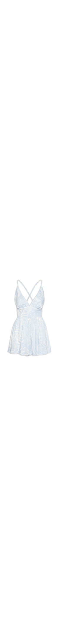 O macaquinho azul é confeccionado em tecido leve sem elasticidade. A peça solta ao corpo possui decote V, alças finas ajustáveis, recorte na altura da cintura, alças cruzadas na parte posterior, recorte em lastex na parte posterior, estampa figurativa em cor contrastante, comprimento curto e fechamento posterior por amarração e zíper.