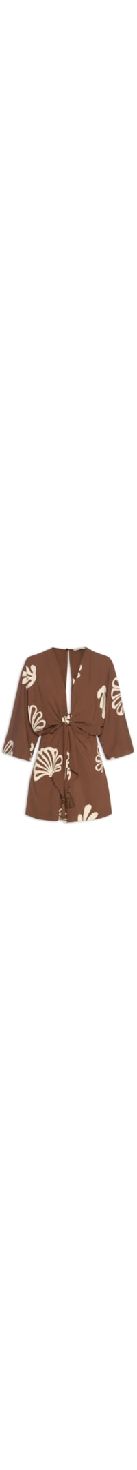 O macaquinho marrom é confeccionado em tecido leve sem elasticidade. A peça solta ao corpo possui decote V, tiras alongadas sobrepostas na parte frontal para amarração em nó, mangas 3/4 amplas, mix de estampas de conchas em cores contrastantes, comprimento curto, recorte posterior vazado e fechamento posterior por zíper invisível e botão.