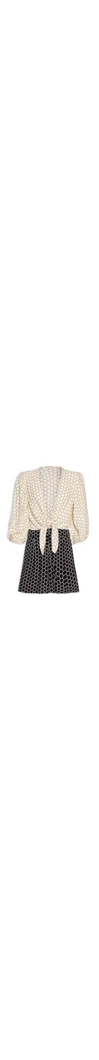O macaquinho preto é confeccionado por tecido leve sem elasticidade. A peça solta ao corpo possui decote V profundo com amarração, mangas 3/4, recorte na altura da cintura em cor contrastante, bolsos frontais no modelo faca, estampa geométrica em cores contrastantes, fechamento frontal por zíper e comprimento curto.