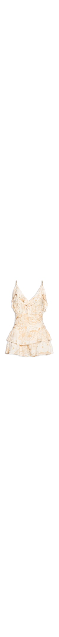 O vestido off white é confeccionado em tecido leve com fios de lurex e sem elasticidade. A peça solta ao corpo possui decote em V, alças finas com regulagem na parte posterior, recortes frontais e posteriores com aplicação de tiras alongadas para efeito de babados, detalhe franzido com efeito drapeado, forro, comprimento curto, mix de estampas em cor contrastante e fechamento posterior por zíper.