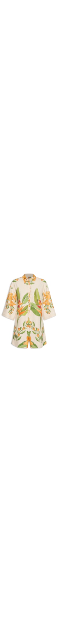 O macaquinho bege é confeccionado em linho misto. A peça possui colarinho simples, ombros estendidos, mangas 3/4 amplas, recorte posterior, comprimento curto, detalhe de fendas laterais, estampa floral em cores contrastantes, shape solto e fechamento frontal por botões.
