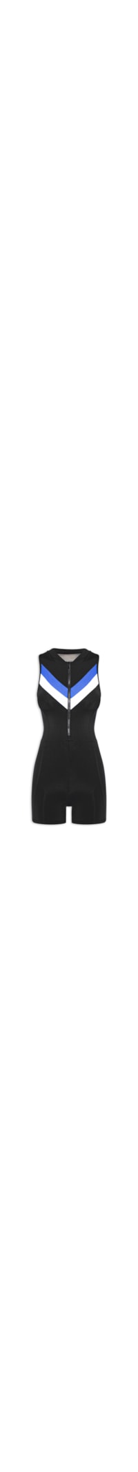 O macaquinho preto é confeccionado em malha leve de alta elasticidade. A peça justa ao corpo, possui decote em V com posterior nadador, cavas estendidas, recortes frontais na altura do busto em cores contrastantes, recorte posterior em tule com leve transparência, recortes posteriores, tag emborrachada da marca aplicada na parte posterior, bojo embutido, comprimento curto, forro e fechamento frontal por zíper.