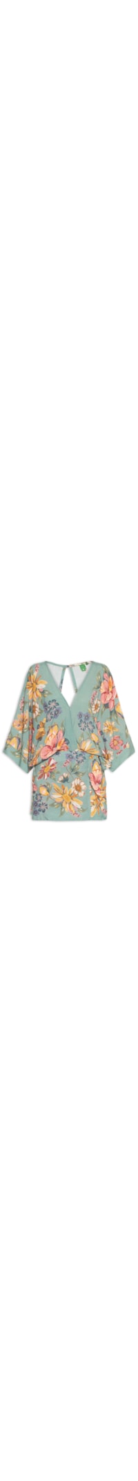 O macaquinho azul é confeccionada em tecido leve sem elasticidade. A peça solta ao corpo possui decote V profundo, mangas longas amplas modelo japonesa, recorte vazado na parte posterior com fechamento por botão, tecido sobreposto com faixa alongada aplicados na lateral para fechamento por amarração, estampa floral em cores contrastantes, comprimento curto e fechamento posterior por zíper invisível.