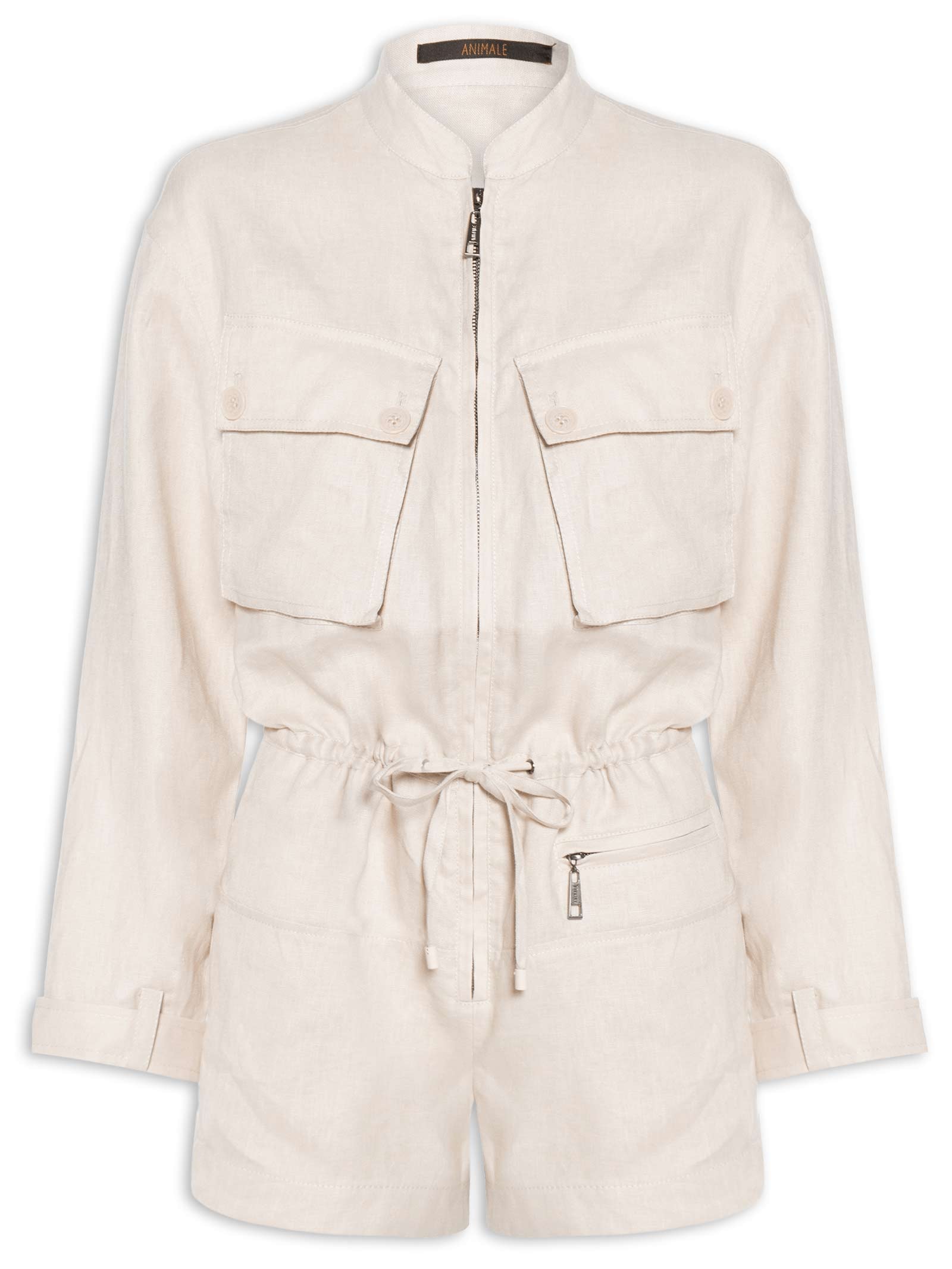 O macaquinho bege é confeccionado em linho sem elasticidade. A peça solta ao corpo possui colarinho mandarim, mangas longas com passantes aplicados nos punhos e faixa para fechamento por botão, bolsos frontais de modelo fole com fechamento por abas sobrepostas e botões aplicados na altura do busto, cintura com cordão embutido para ajuste, bolsos frontais embutidos, bolsos frontais embutidos com fechamento por zíper e fechamento frontal por zíper.