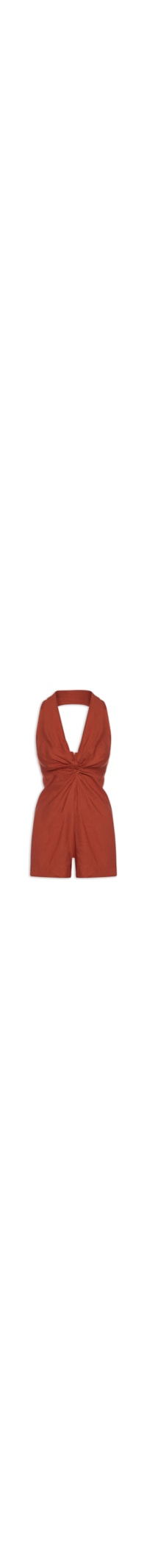 O macaquinho vermelho é confeccionado em tecido leve com toque de linho sem elasticidade. A peça solta ao corpo de modelo frente única possui decote V profundo com detalhe de faixa aplicada e leve franzido, comprimento curto e fechamento posterior por zíper.