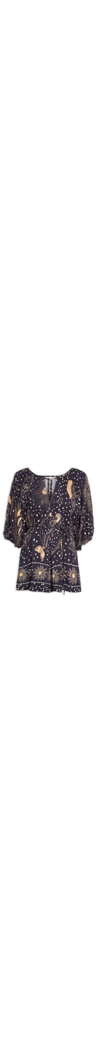 O macaquinho preto é confeccionado em tecido leve sem elasticidade. A peça solta ao corpo possui decote canoa, mangas curtas bufantes com elástico no ombro e no punho, recorte vazado frontal e posterior, passante aplicado na altura da cintura, estampa figurativa em cor contrastante, comprimento curto, barra alongada, sem forro, fechamento posterior por botão no decote, acompnha cinto fino com detalhe metálico aplicado nas ponteiras para amarração.