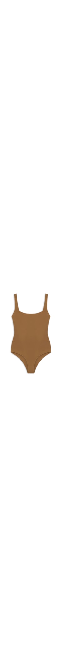 O maiô marrom é confeccionado em malha de poliamida com alta elasticidade. A peça justa ao corpo possui decote quadrado, alças médias e tira fina removível aplicada na parte posterior.