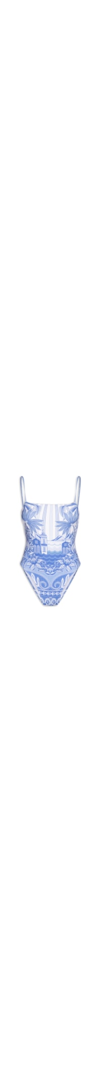 O maiô azul é confeccionado em malha de poliamida com alta elasticidade. A peça justa ao corpo possui decote reto, alças finas estendidas reguláveis, decote posterior em U, mix de estampas em cores contrastantes, forro e fechamento posterior por amarração.