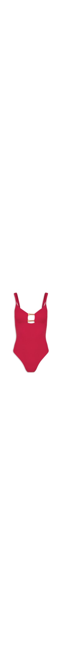 O maiô vermelho é confeccionado em malha leve com superfície texturizada de média elasticidade. A peça justa ao corpo, possui decote em V, alças médias com regulagem, recorte vazado frontal com tiras finas embutidas entrelaçadas em cordão e aplicação metálica, recorte na parte inferior do busto com leve franzido, bojo removível e forro.