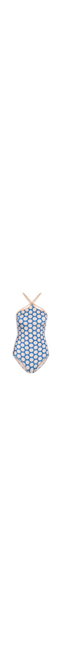 O maiô azul é confeccionado em malha com alta elasticidade. A peça possui decote halter, alças finas com ponteiras metalizadas com transpasse e amarração posterior, cava regular, bojo removível, recorte vazado, estampa poá em cor contrastante e forro.