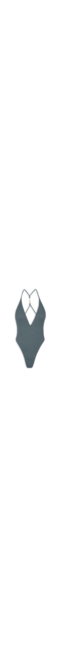 O maiô azul é confeccionado em malha. A peça possui decote em V profundo, alças finas com aviamento metalizado na parte posterior, recortes na cintura, acabamento texturizado bojo removível e cavas estendidas.
