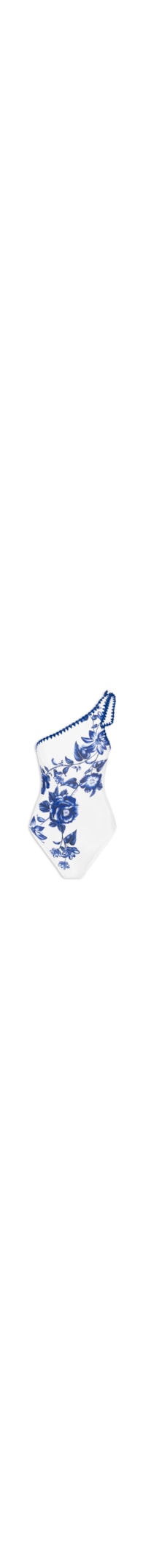 O maiô branco é confeccionado em malha com alta elasticidade. A peça possui decote ombro único, alça média alongada para amarração, alça e decote com aplicação de crochê azul, forro, sem bojo e estampa floral na cor azul.