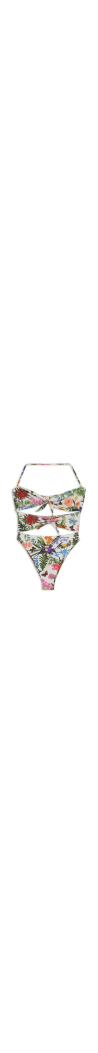 O maiô branco é confeccionado em malha microfibra com alta elasticidade. A peça de modelo tomara que caia possui decote coração, recortes posteriores e frontais vazados, faixas alongadas na parte frontal para amarração, mix de estampas em cores contrastantes, forro e fechamento posterior por colchete.
