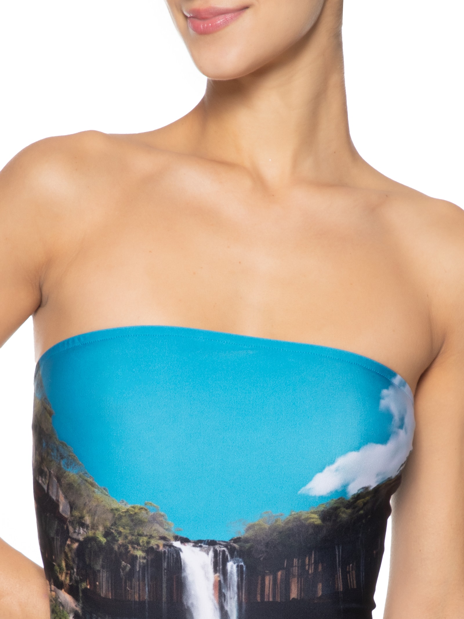 O maiô marrom é confeccionado em malha com alta elasticidade. A peça de modelo tomara que caia possui decote reto com elásico embutido, forro, sem bojo e estampa figurativa de paisagem em cores contrastantes.