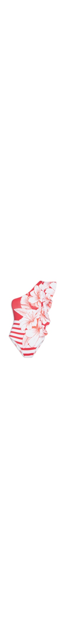 O maiô vermelho é confeccionado em malha de poliamida com alta elasticidade. A peça justa ao corpo possui decote assimétrico, alça largas, babados aplicados na lateral, estampa floral na cor branca e forro.